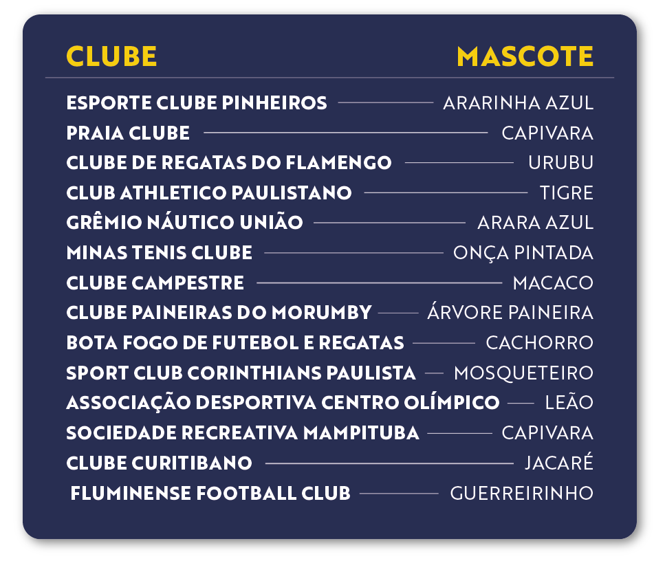 A lista final de candidatos leva em consideração os mascotes dos nossos clubes irmãos do Comitê Brasileiro de Clubes (CBC):