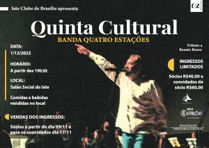 Anote na agenda: dia 1º de dezembro tem “Quinta Cultural”. O evento será no Salão Social, a partir das 19h30, com apresentação do grupo brasiliense Quatro Estações, que faz sucesso