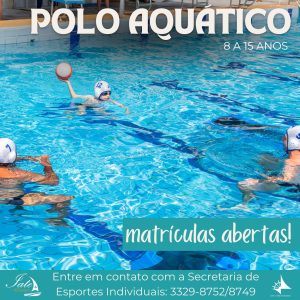 Estão abertas as inscrições para a Escola de Polo Aquático, com vagas para alunos entre 8 e 15 anos. As aulas ocorrem às 18h30, sempre às quartas e sextas-feiras. Os