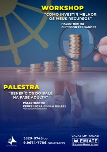 Às 10h do dia 21 de maio acontecerá, no Salão Social, um workshop sobre gestão financeira com o tema “Como investir melhor os meus recursos”, ministrado pelo sócio Gleysson Fernandes