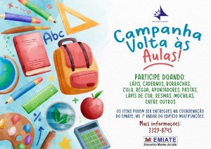 O Emiate está arrecadando doações de materiais escolares para realizar a campanha “Volta às Aulas”. A meta é beneficiar as crianças assistidas pelas instituições sociais cadastradas pelo Encontro Master. Os