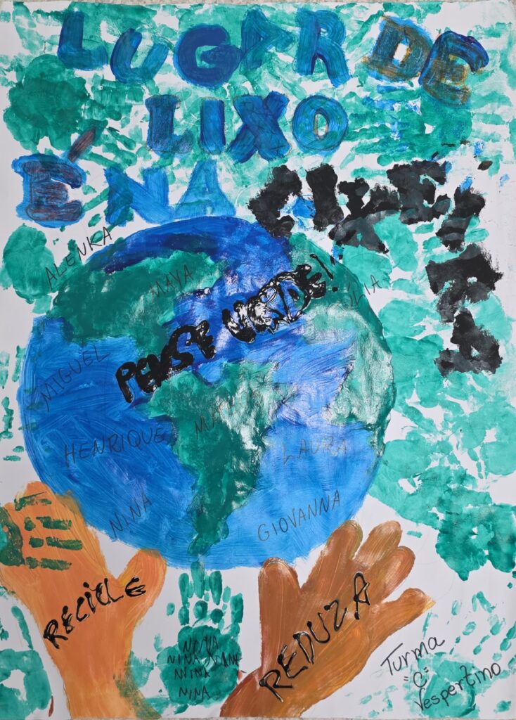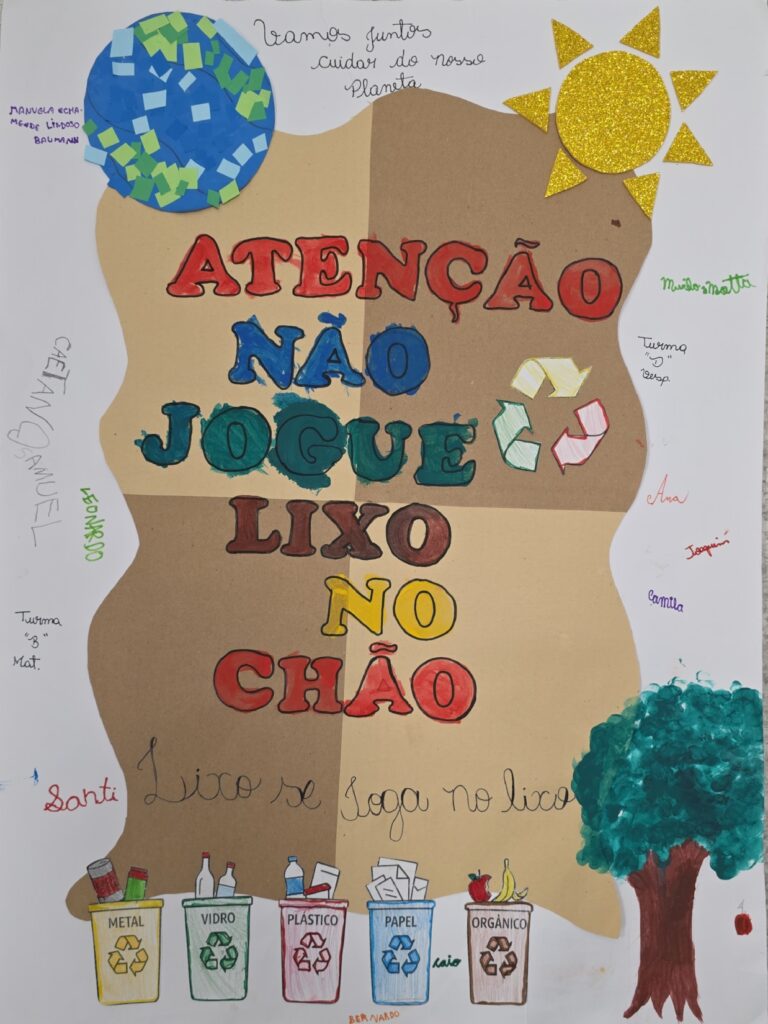 Com o cartaz, ele conta que a ideia foi expressar a importância de deixar um mundo “mais limpo”. “A gente quis mostrar para as pessoas que não devemos jogar lixo no chão. Eu achei uma atividade muito boa para estimular a limpeza e a organização para termos um lugar bem cuidado”, destaca.