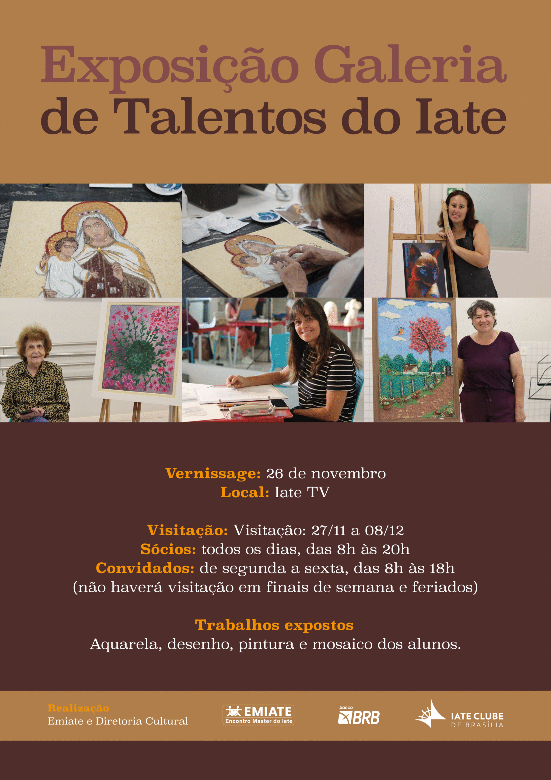 Na próxima quarta-feira, 26 de novembro, o Encontro Master do Iate e a Diretoria Cultural irão realizar a vernissage “Galeria de Talentos do Iate”, com os trabalhos produzidos pelos alunos dos cursos de aquarela, desenho, mosaico e pintura do Emiate. O evento será às 19h, no Iate TV.