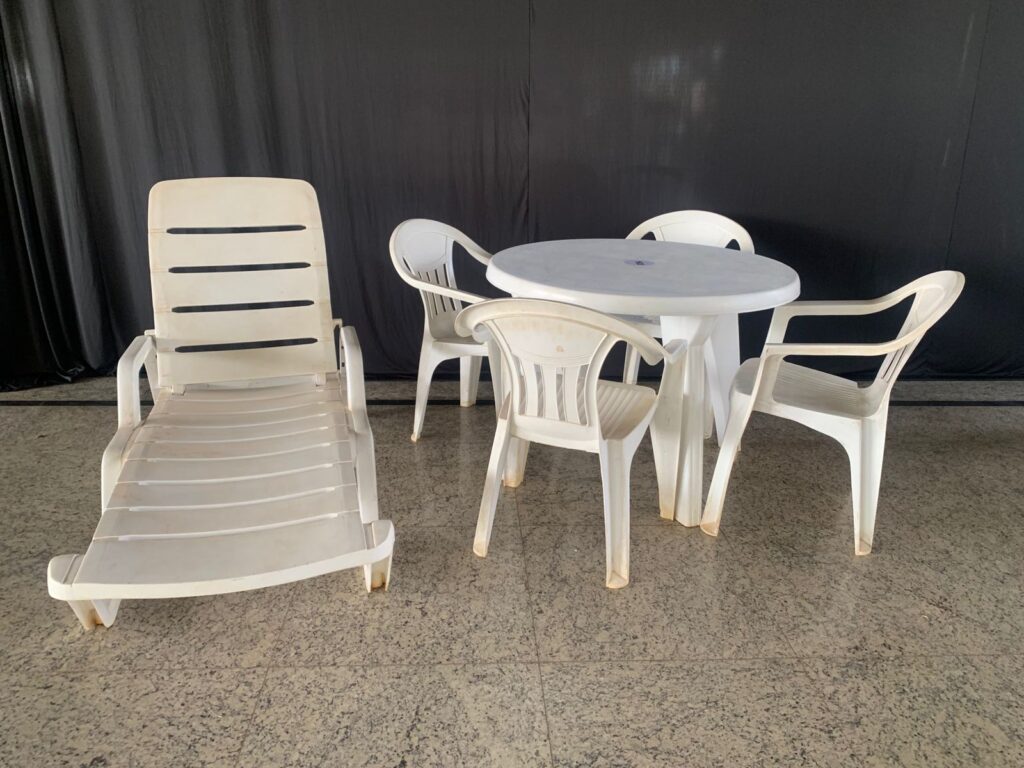Estão à venda 45 jogos compostos por uma mesa plástica redonda, quatro cadeiras e uma espreguiçadeira no valor unitário de R$ 400. Esses conjuntos, embora substituídos por modelos mais modernos, ainda estão em bom estado de conservação e prontos para uso.