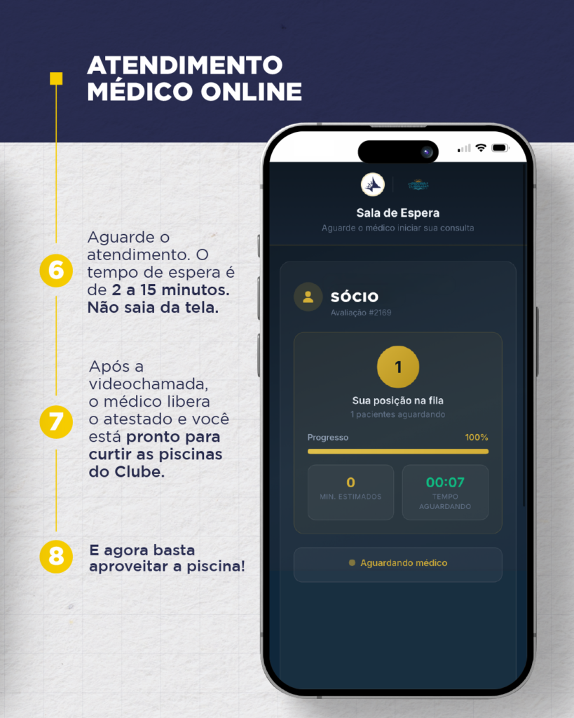 - Após a videochamada, estando tudo certo, o médico libera o atestado e você já fica liberado para curtir as piscinas do Clube; e